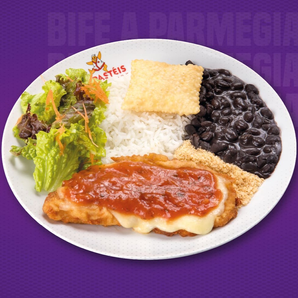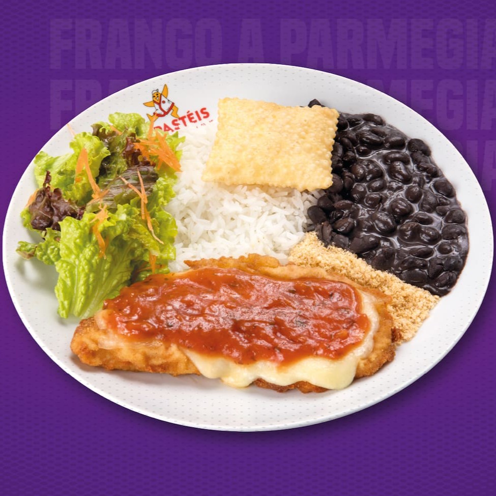 Saborosíssimo frango à parmegiana, acompanhado de arroz, feijão, farofa, salada e nosso delicioso pastel júnior de queijo.