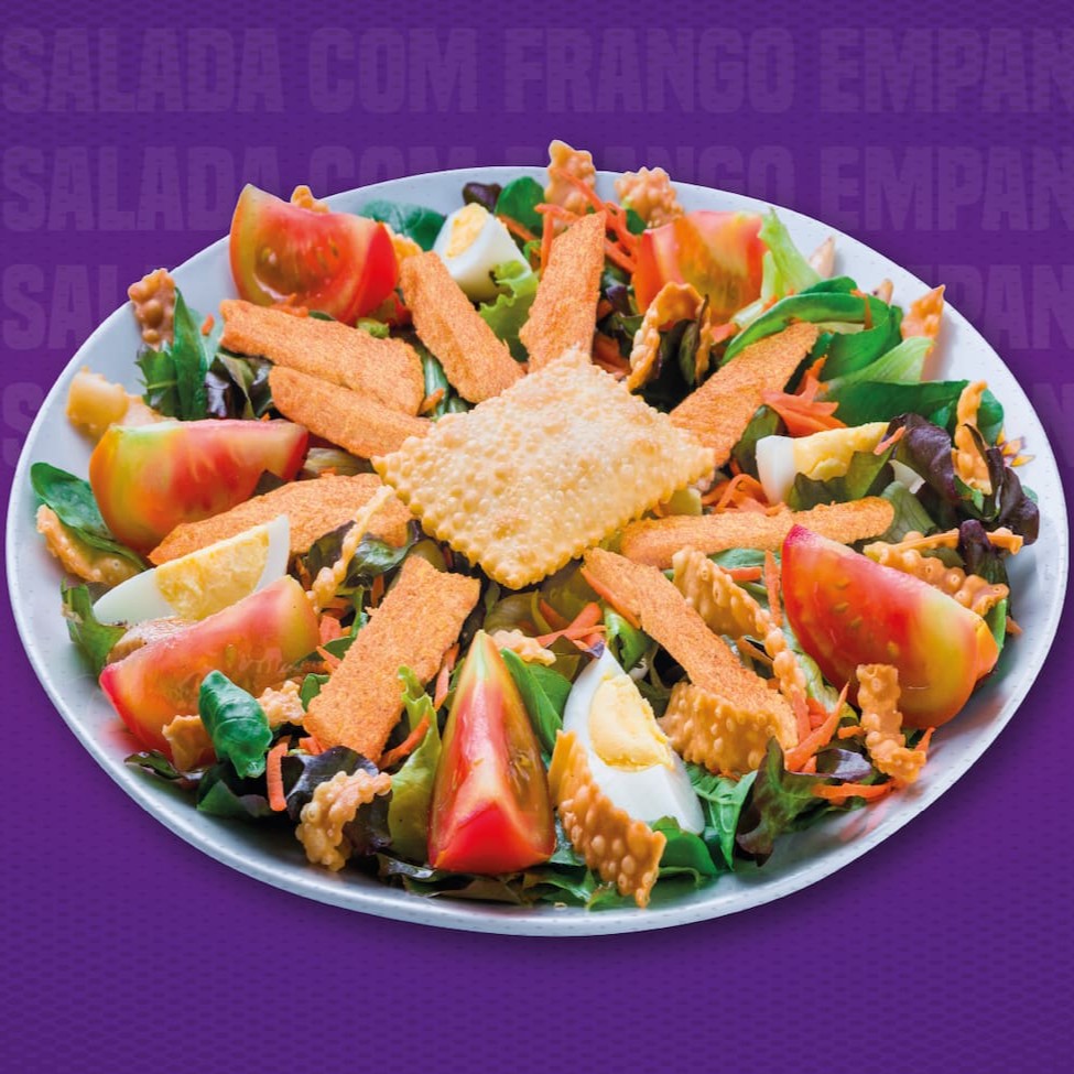 Deliciosas tiras de frango empanado acompanhado do Mix Verde, Cenoura, Tomate, Ovo Cozido, Queijo Muçarela, Rets (massa de pastel frita) e do nosso querido pastel jr. De queijo