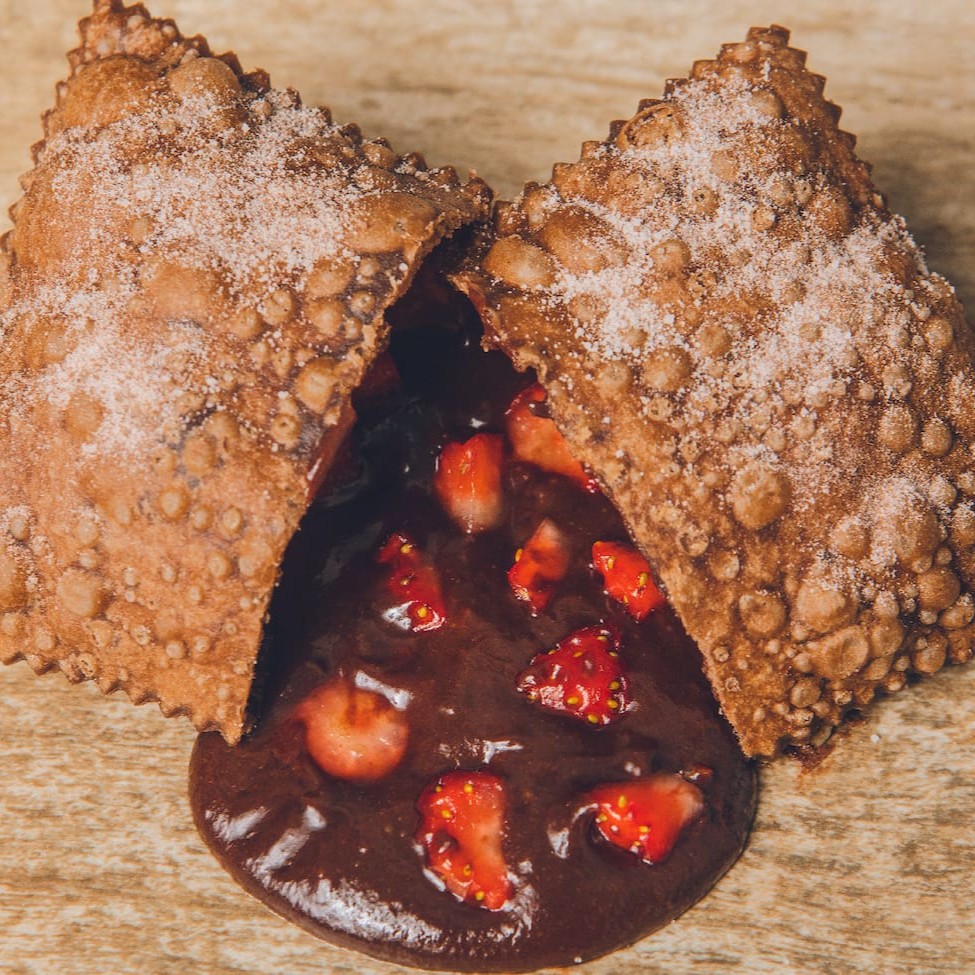 Deliciosa massa crocante recheada de brigadeiro cremoso e morangos frescos, polvilhada com açúcar e chocolate.