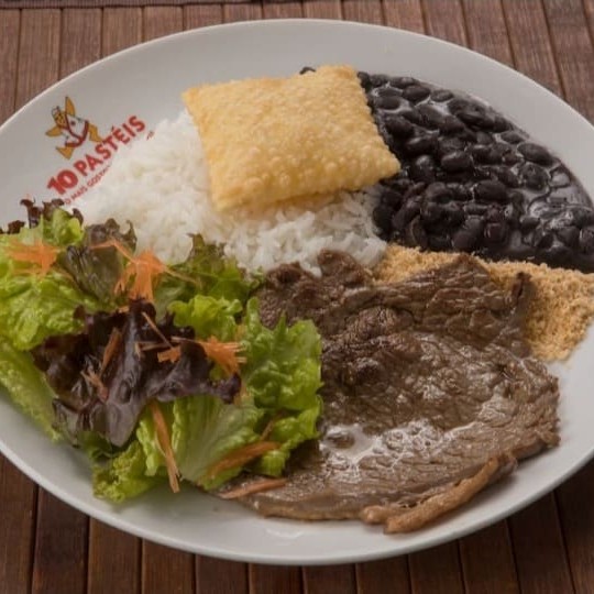 Delicioso bife grelhado, arroz, feijão, farofa, salada e 1 pastel jr de queijo .