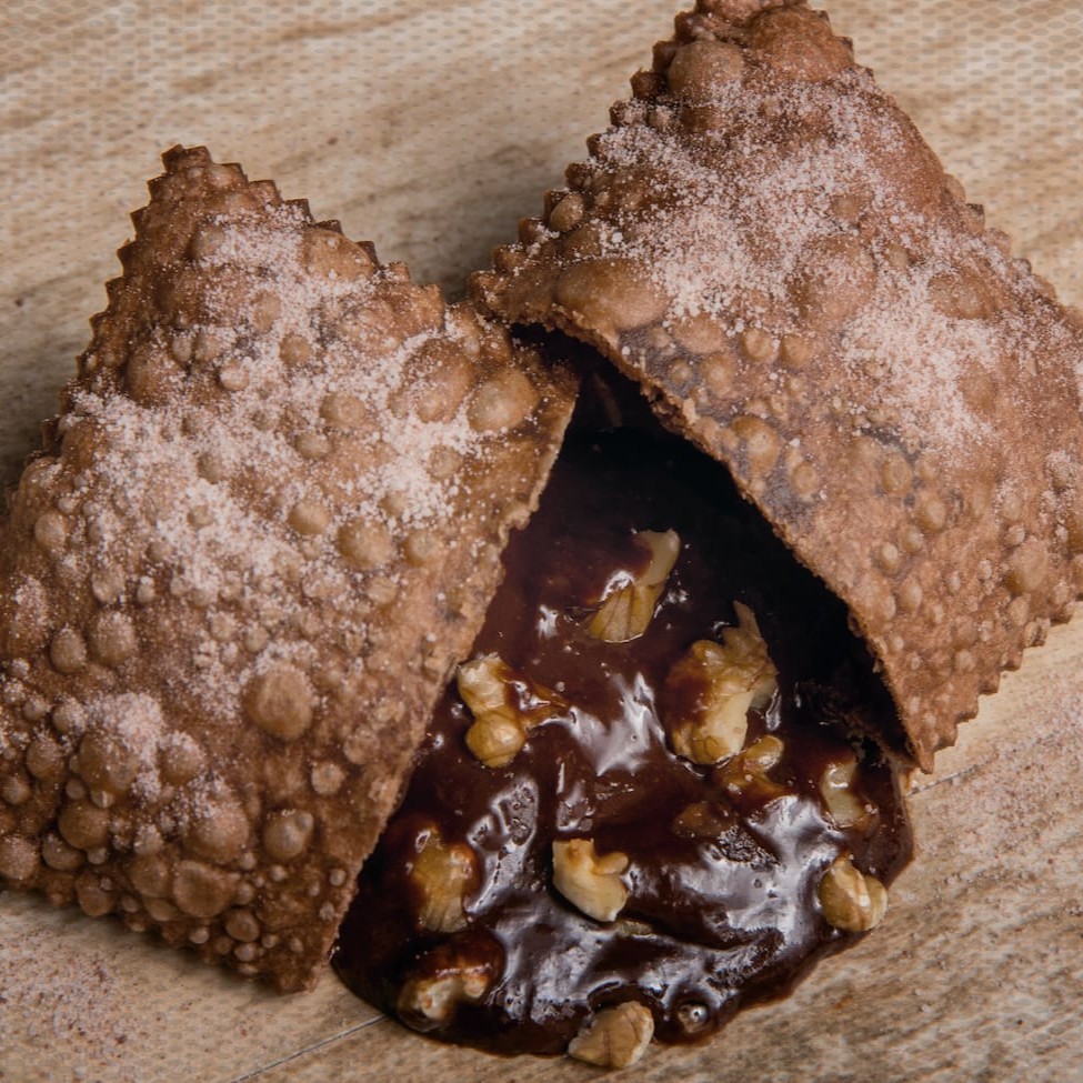Delicioso pastel polvilhada no açucar e chocolate, recheado com nosso brigadeiro cremoso e nozes crocantes.