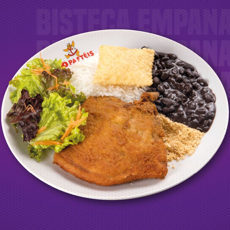 Deliciosa bisteca empanada, acompanhada de arroz, feijão, farofa, salada e nosso querido pastel júnior de queijo.