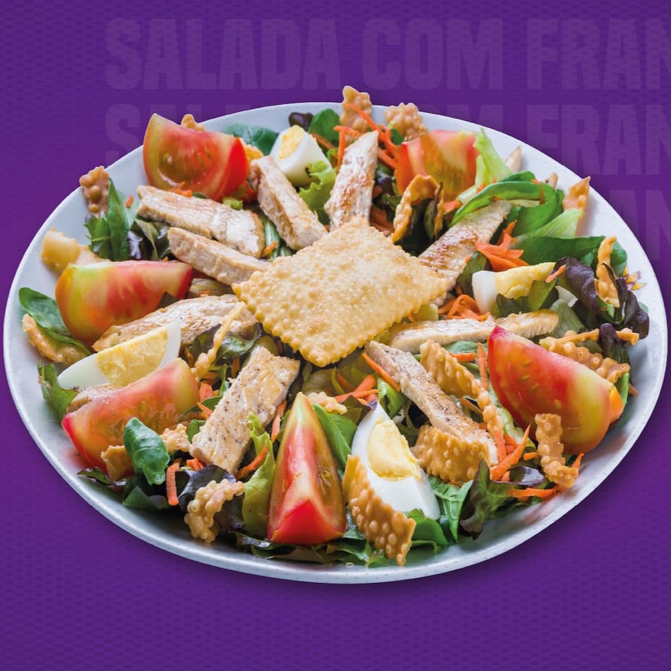 Deliciosas tiras de frango grelhado acompanhado do Mix Verde, Cenoura, Tomate, Ovo Cozido, Queijo Muçarela, Rets (massa de pastel frita) e do nosso querido pastel jr. De queijo