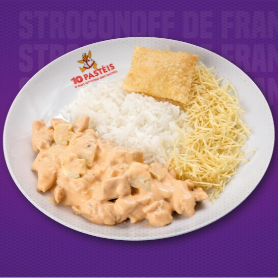 Cremosíssimo Strogonoff de frango com champignon, arroz soltinho, batata palha bem crocante e nosso querido pastel júnior de queijo