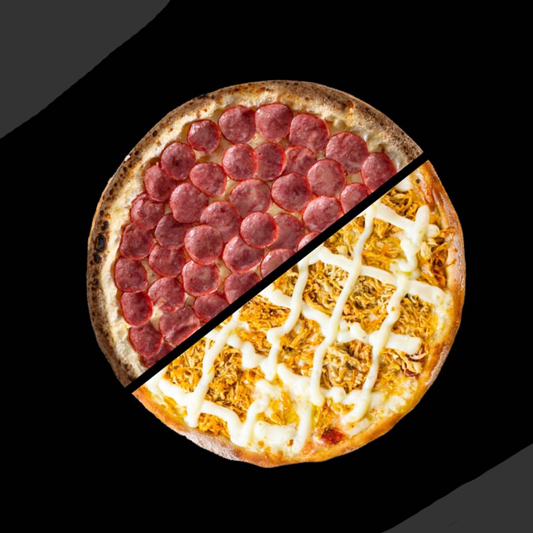 Pizza Média do seu jeito: escolha a massa, aproveite 6 fatias práticas e combine até 2 sabores.