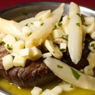 Grelhado na manteiga e coberto com aspargos, palmito e champignon. Escolha os acompanhamentos de sua preferência.