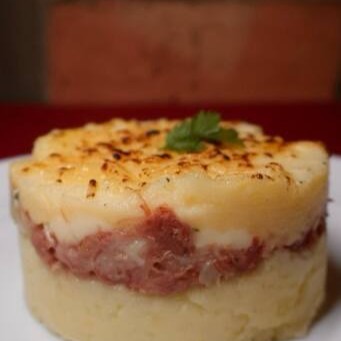 Carne seca desfiada refogada com especiarias, creme de requeijão cremoso, purê de batata e finalizado com queijo parmesão gratinado;