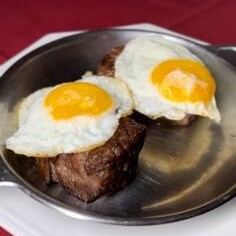 Grelhado na manteiga com ovos fritos a cavalo. Escolha os acompanhamentos de sua preferência.