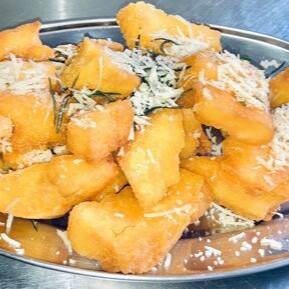Polenta com queijo parmesão e frita, finalizada com alecrim e queijo ralado