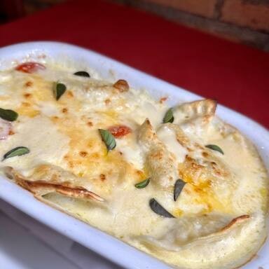 Massa artesanal recheada com quatro queijos, banhada ao molho rosé com camarões pequenos e gratinada ao forno com queijo parmesão.