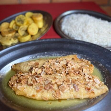 Grelhado na manteiga e banhado com molho de limão e amêndoas. Acompanha arroz branco e batata souté.