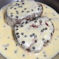 Grelhado com manteiga coberto com nata fresca e pimentas verdes selecionadas. Escolha os acompanhamentos de sua preferência.