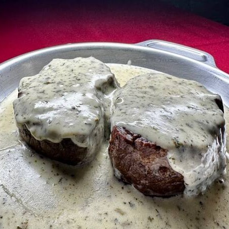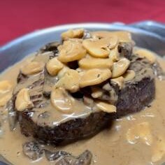 Cortes especiais de mignon, flambados no whisky, coberto com nata fresca e champignons. Acompanha arroz branco e batata palha (feita por nós)