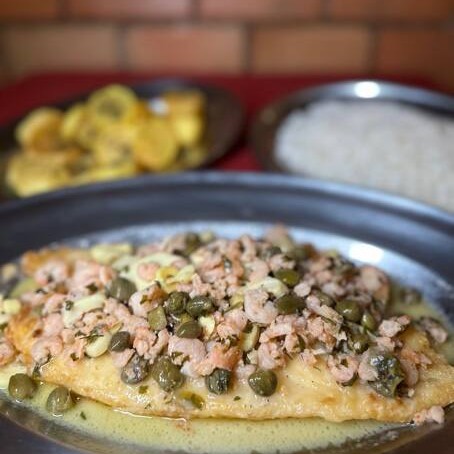 Grelhado na manteiga e banhado ao molho de champagne brut, camarões e alcaparras. Acompanha arroz branco e batata souté.