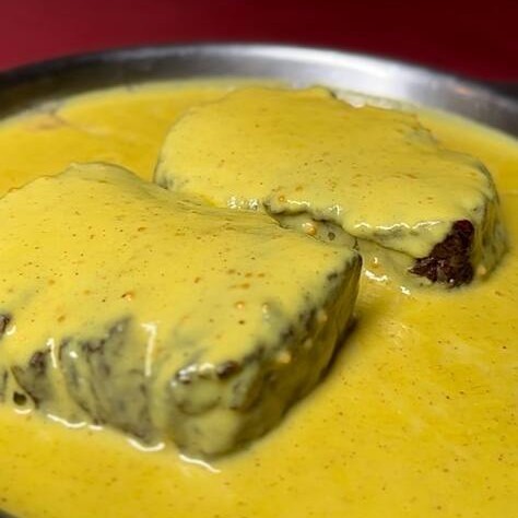 Grelhado na manteiga coberto com nata fresca, mostarda tradicional, mostarda escura e grãos de mostarda. Escolha os acompanhamentos de sua preferência.