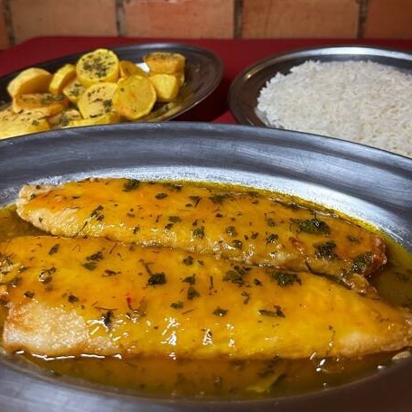 Grelhado na manteiga e banhado ao molho laranja. Acompanha arroz branco e batata souté.
