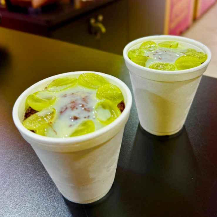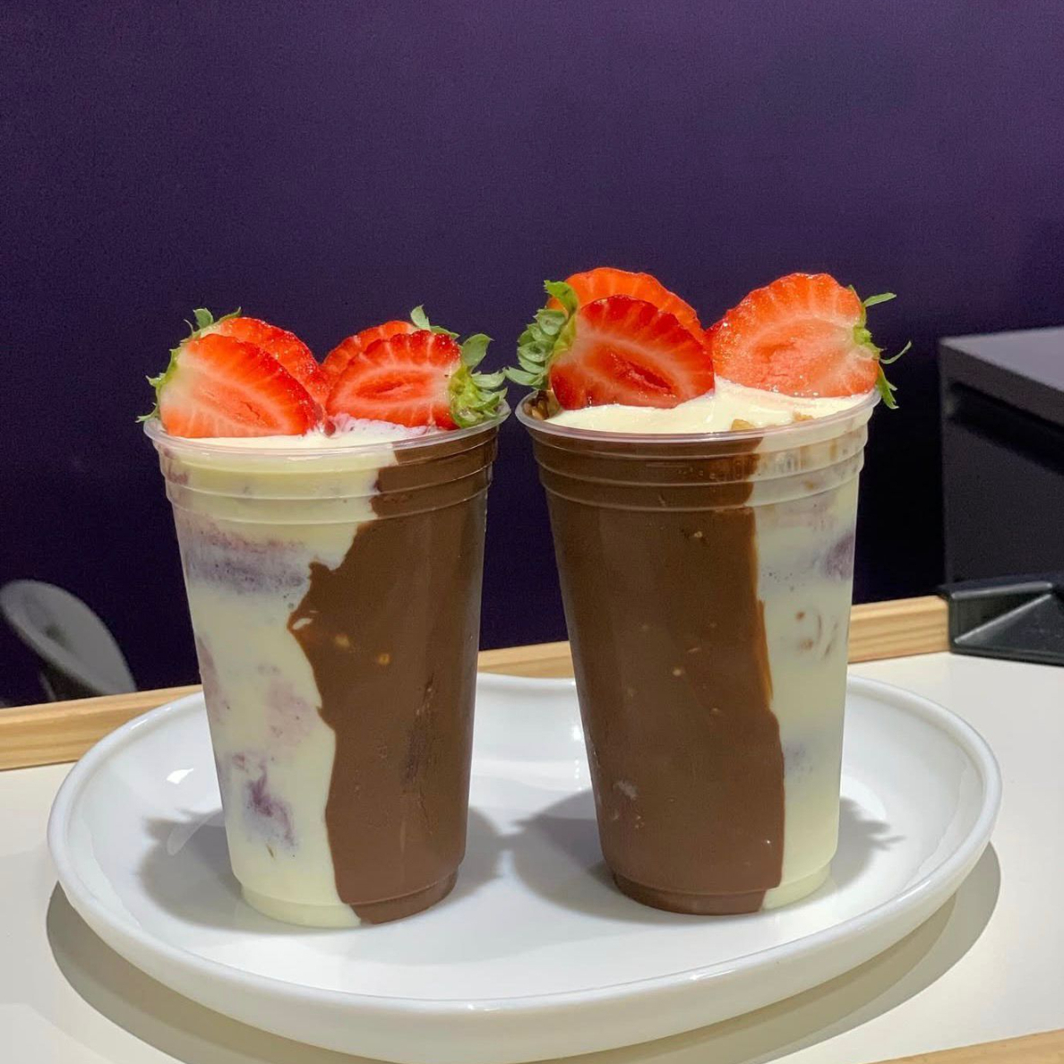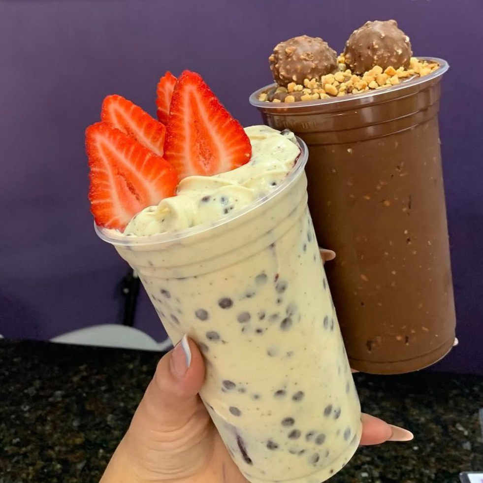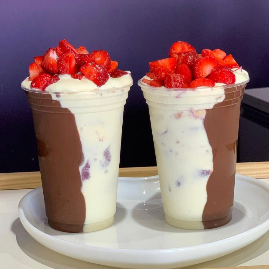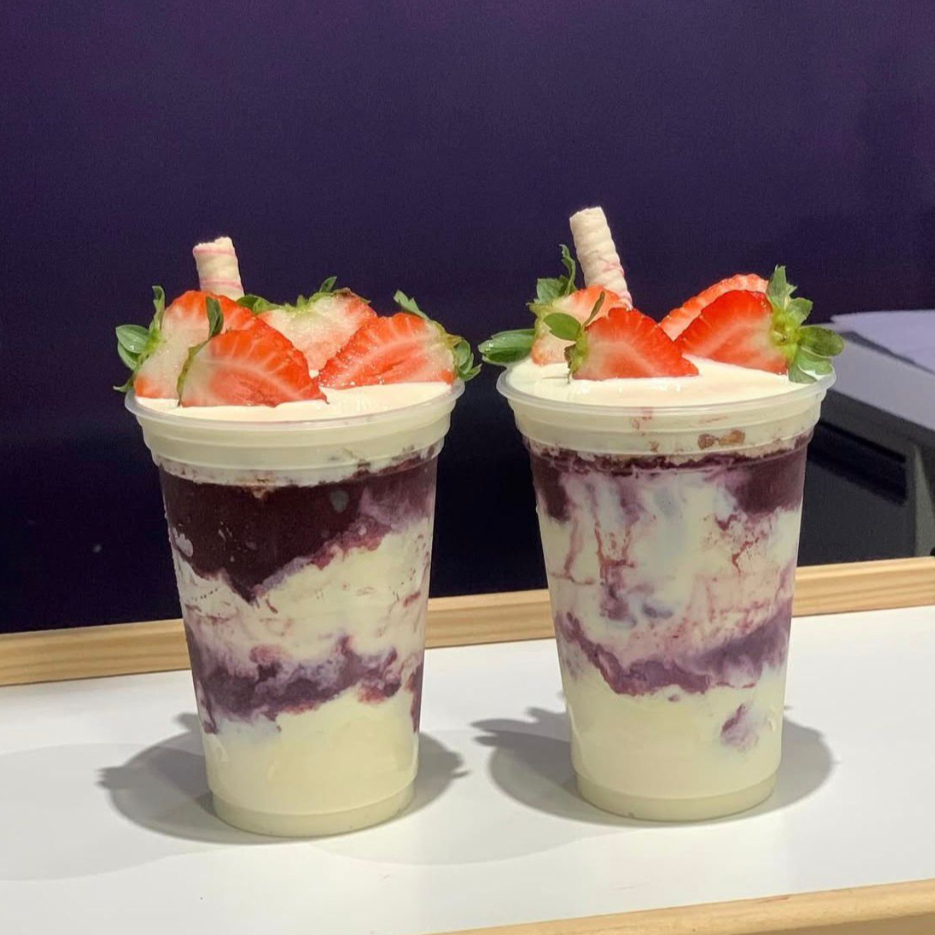 2 deliciosos copos de 330ml com açaí recheados, com Morangos fresquinhos, leite condensado e leite em pó.