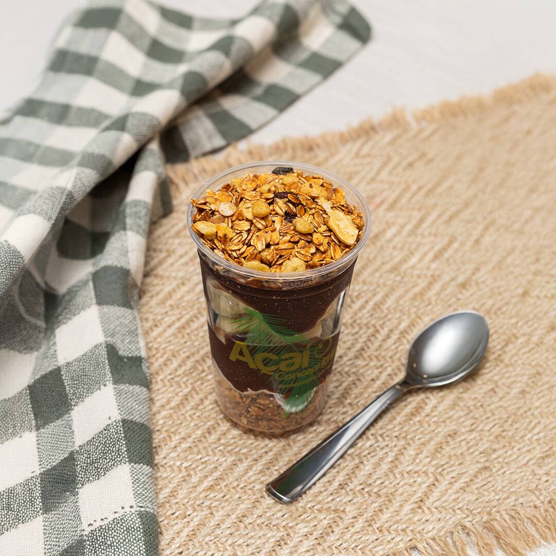 Açaí tradicional de 300ml com granola, banana e leite condensado: uma explosão de sabores que combina a cremosidade do açaí, a crocância da granola, a doçura da banana e o toque indulgente do leite condensado. Uma experiência irresistível em cada colherada!