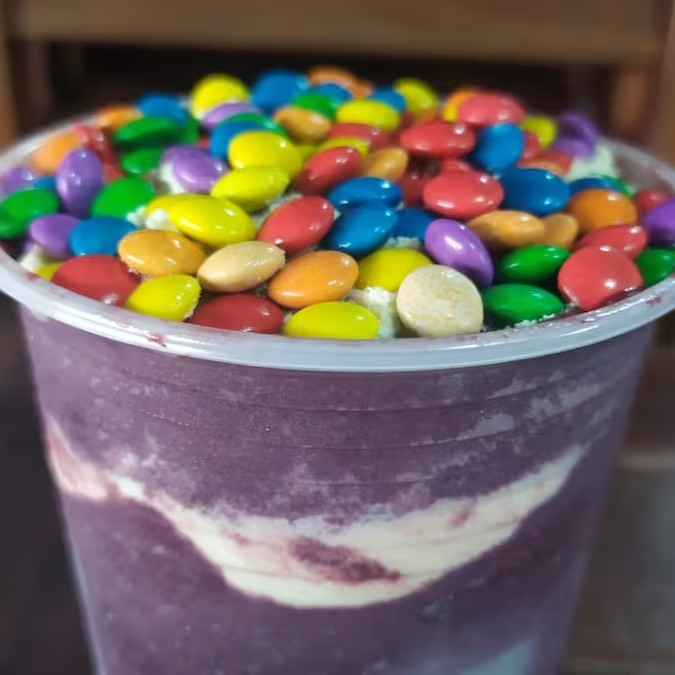 Combinação de Açai, leite em pó, confete, morango, leite condensado e banana