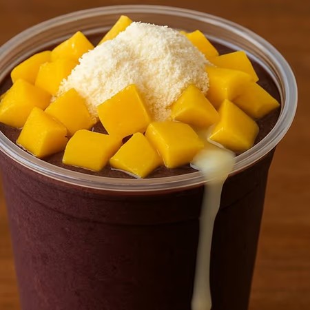 Açaí no copo com manga, leite em pó e leite condensado refrescante e delicioso! Nosso açaí é servido no copo, coberto com cubos suculentos de manga, uma generosa camada de leite em pó e um toque doce de leite condensado. A mistura perfeita entre a acidez suave da manga e a cremosidade do açaí, criando uma experiência única e irresistível a cada colherada!