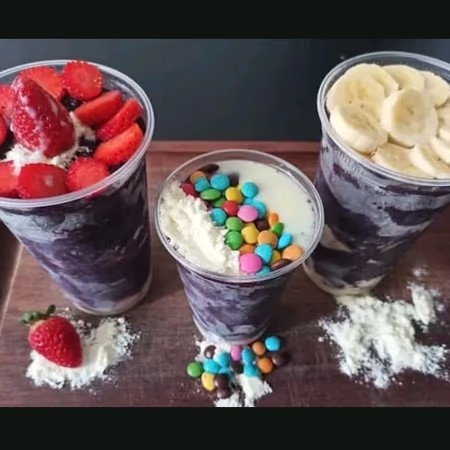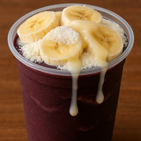 Açaí no copo com banana, leite em pó e leite condensado. Cremoso, geladinho e irresistível! Nosso açaí é servido em copo, coberto com rodelas frescas de banana, uma generosa camada de leite em pó e um delicioso fio de leite condensado. A combinação perfeita entre o sabor marcante do açaí e a doçura dos complementos. Ideal para matar a vontade de um doce refrescante a qualquer hora do dia!