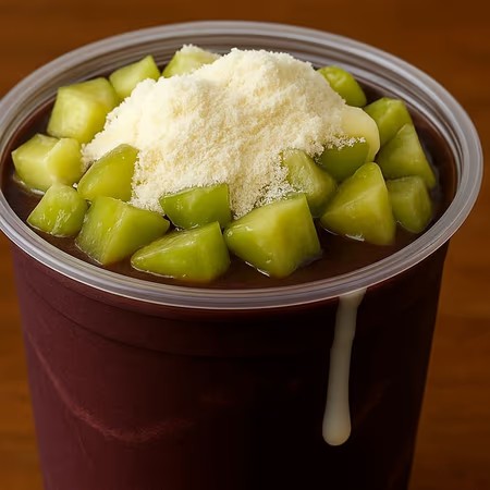 Uma explosão de sabor em cada colherada! Delicioso açaí cremoso servido em um copo generoso, coberto com uvas verdes picadas que trazem um toque refrescante e suave. Por cima, uma camada de leite condensado escorrendo delicadamente entre as frutas, finalizada com uma generosa porção de leite em pó, criando um contraste irresistível de texturas e sabores. Perfeito para quem busca uma combinação doce, frutada e incrivelmente saborosa!