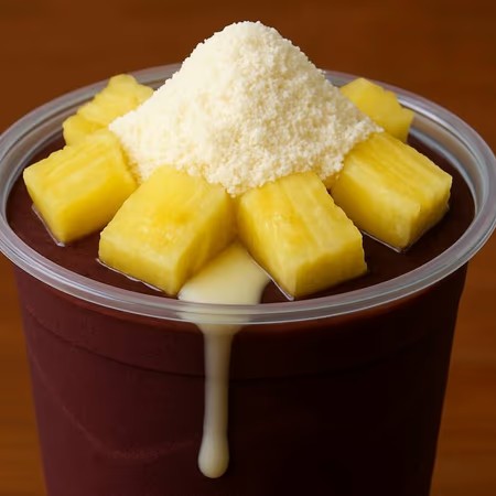 Um irresistível copo de açaí cremoso, montado em camadas que combinam a intensidade do açaí gelado com a doçura envolvente do leite condensado e a suavidade do leite em pó. Para completar, pedaços suculentos de abacaxi trazem um toque tropical e refrescante, equilibrando perfeitamente o sabor e transformando cada colherada em uma explosão de frescor e sabor.