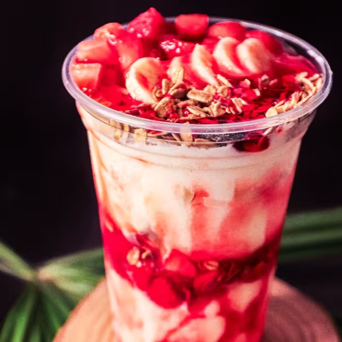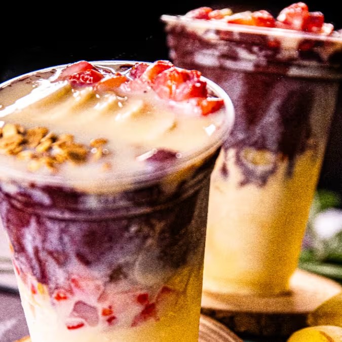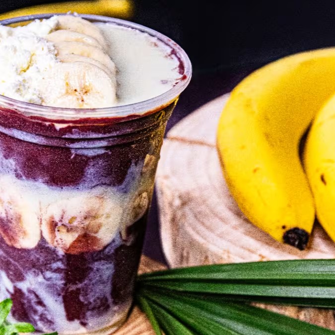 Este saboroso copo de açaí é cuidadosamente enriquecido com o doce leite condensado, a cremosidade do leite em pó e a suavidade das bananas frescas. Uma mistura irresistível que certamente irá encantar o seu paladar. Por favor, note que não podemos fazer alterações neste copo. Aproveite esta oferta limitada!