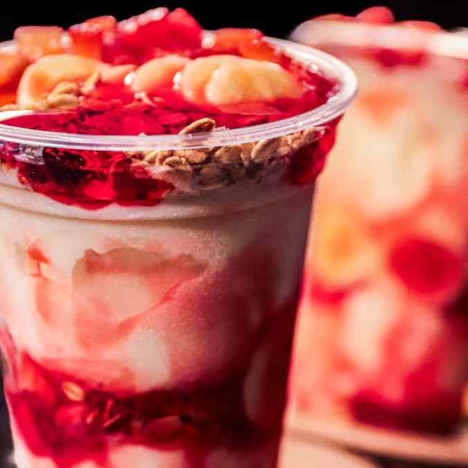 Sirva nossos 2 Copos Mestre Fitness, uma oferta exclusiva da nossa categoria 'Promoção Açaí do Mestre'. Este é um açaí de altíssima qualidade, combinado com o mais puro Whey Protein sabor baunilha, bananas frescas e crocante granola. Cada ingrediente foi meticulosamente escolhido para proporcionar um sabor inigualável e um impulso nutritivo ao seu Dia. Por favor, observe que não é possível fazer alterações neste copo. É uma combinação perfeita, criada pelo nosso Mestre, para trazer a você uma experiência fitness deliciosa e saudável.