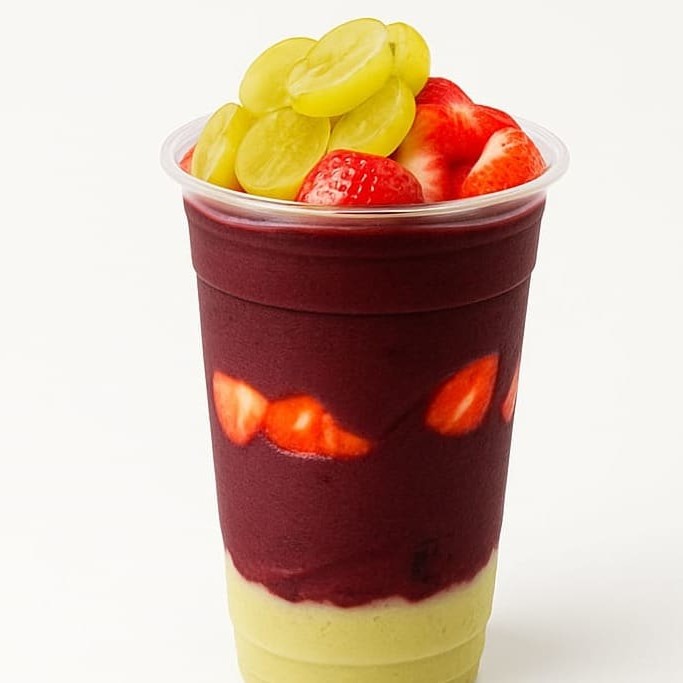 Açaí Tropical 500ml Uma explosão de sabores tropicais em cada colherada! Nosso copo Tropical vem com um cremoso açaí, coberto com leite condensado, banana fatiada, morangos fresquinhos e uva thompson — tudo na medida certa pra refrescar e adoçar seu Dia. Perfeito pra quem ama uma combinação leve, frutada e irresistível!