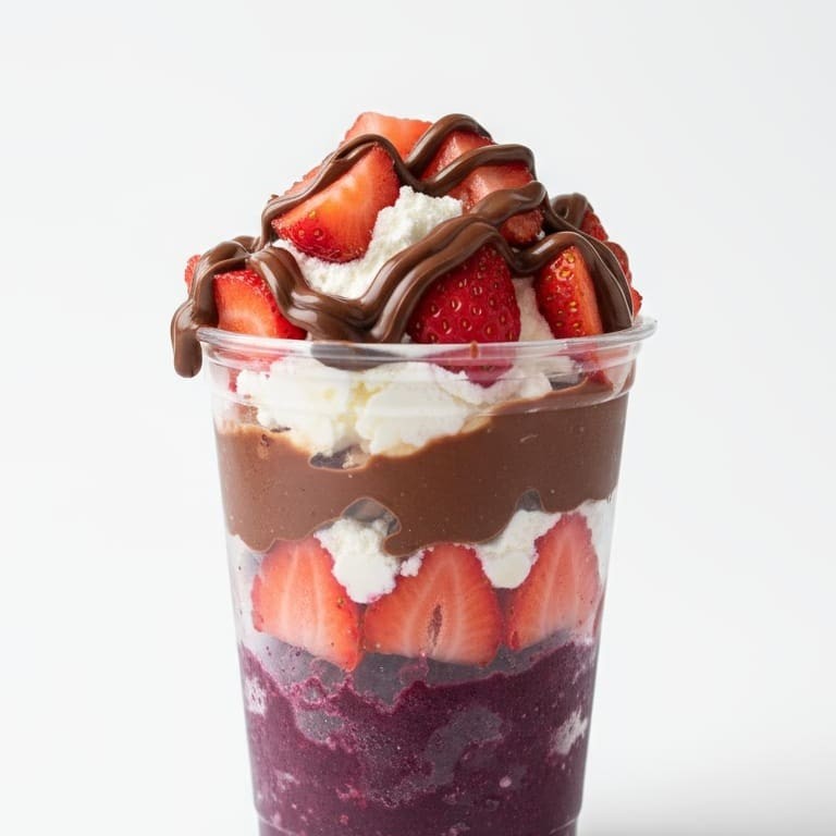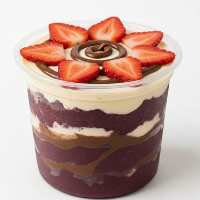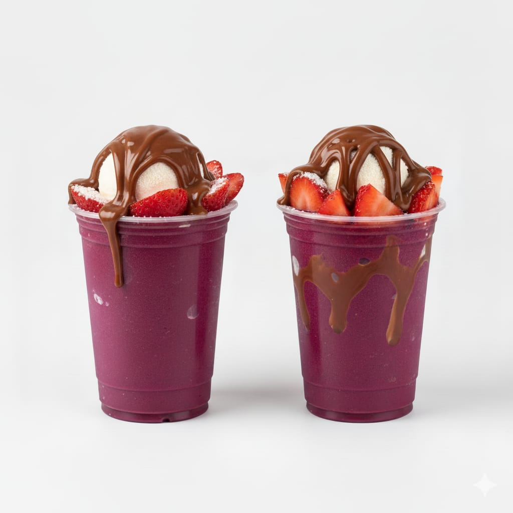 Açaí Ninho + Nutella– 500ml Prepare-se pra se apaixonar! Um copo generoso de 500ml com açaí super cremoso, coberto com morangos fresquinhos, muito leite condensado, Nutella cremosa e uma chuva deliciosa de leite Ninho. A mistura perfeita do doce, frutado e cremoso – é puro comfort food gelado em cada colherada. Um verdadeiro pecado que você vai querer repetir!