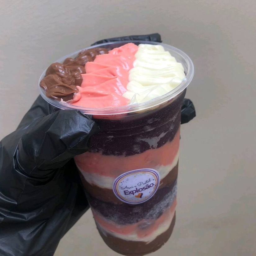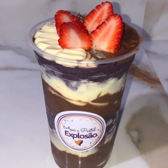 Um copo recheado de sabores , copo trufado com três camadas de cremes ( Creme de Avela , Creme de Leitinho , Creme de Morango ) , uma verdadeira explosão a cada colherada .
