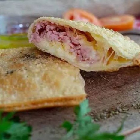 Nesse delicioso pastel vai queijo mussarela , presunto , tomate e um toque final de orégano , com aproximadamente 20 centi