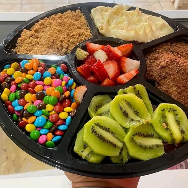 Uma linda e deliciosa roleta de açaí, com 6 divisórias , todas preenchida de açaí com os complementos em cima , servindo de ( 3 a 4 Pessoas ) .