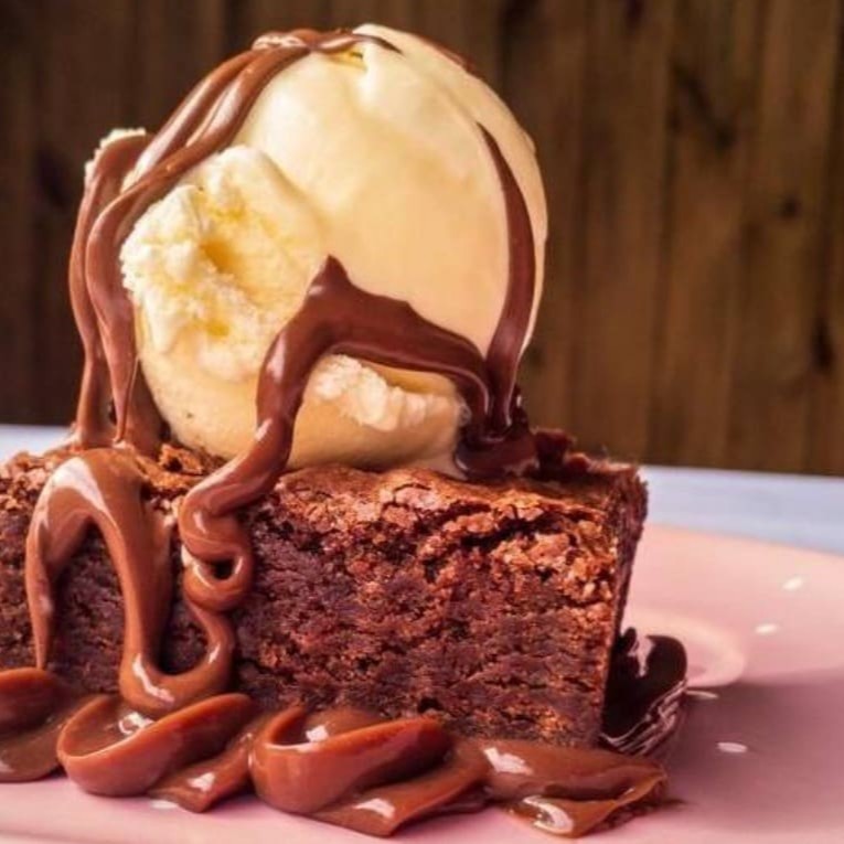Nosso delicioso e chocolatudo brownie, com calda de sorvete e o gelado a sua escolha! Foto Ilustrativa Produto de consumo imediato.