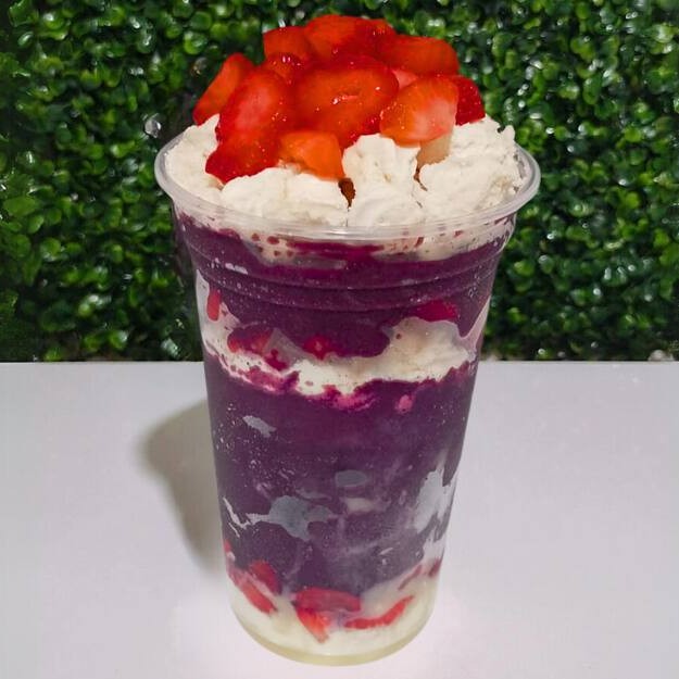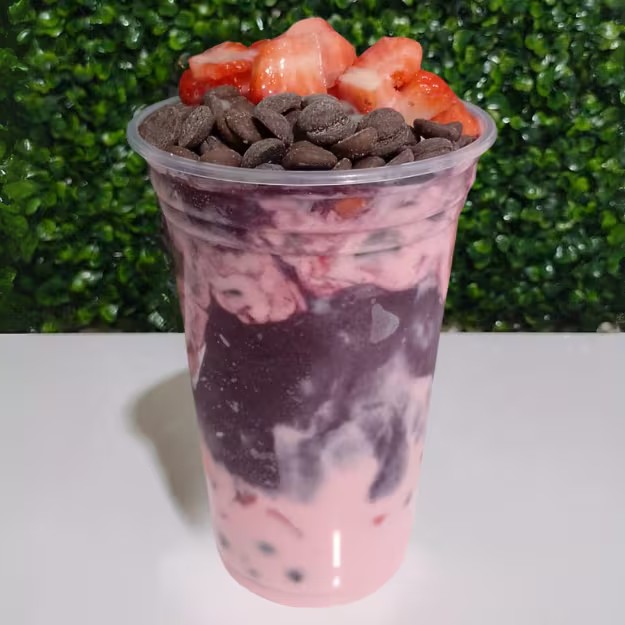 Açaí cremoso com banana, morangos frescos, granola crocante e um toque de leite em pó. Leve, refrescante e cheio de energia — a combinação perfeita pra quem busca sabor e equilíbrio no mesmo copo.