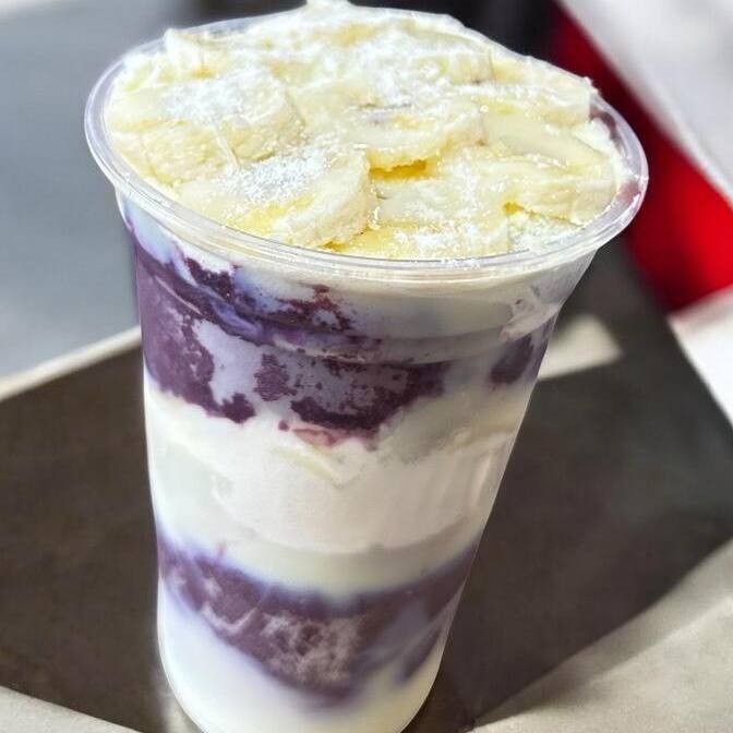 2 copos de 400ml acompanhados de leite cond, leite em pó e banana.