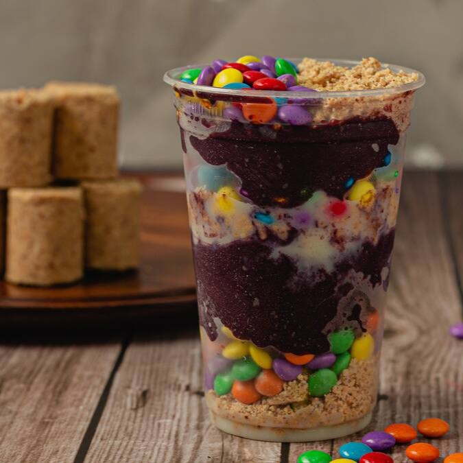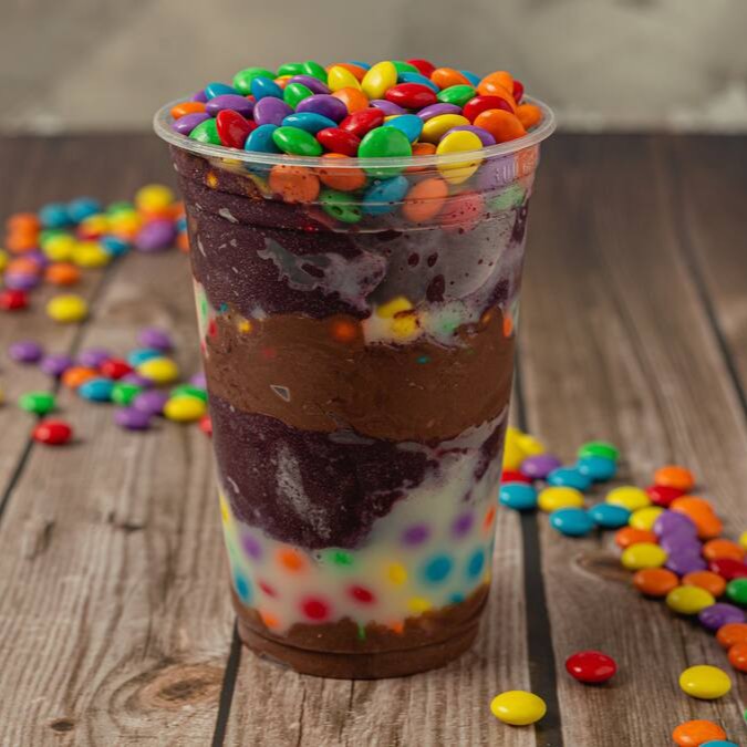 Nosso espetacular creme de açaí recheado com uma combinação perfeita de leite condensado, creme de avelã e confetes.