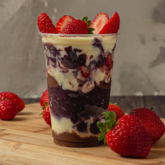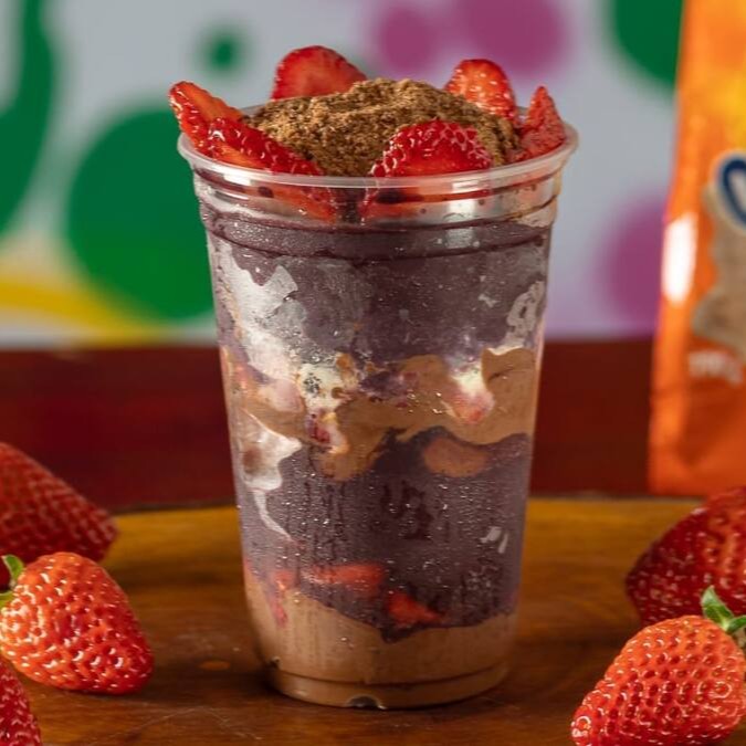Nosso delicioso creme de açaí recheado com um espetacular creme de avelã, leite em pó e morangos selecionados.