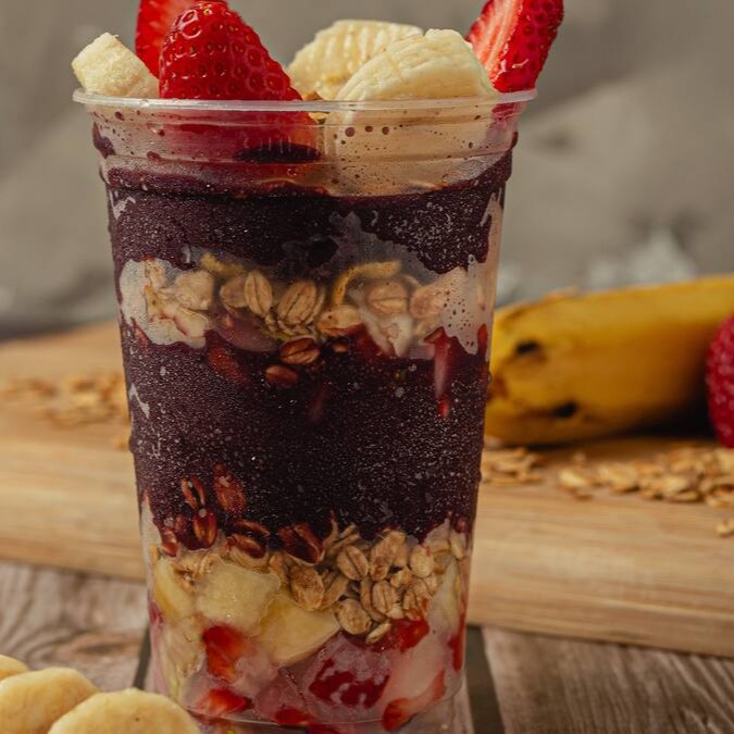 Nosso delicioso creme de açaí recheado com granola, banana e morangos selecionados.