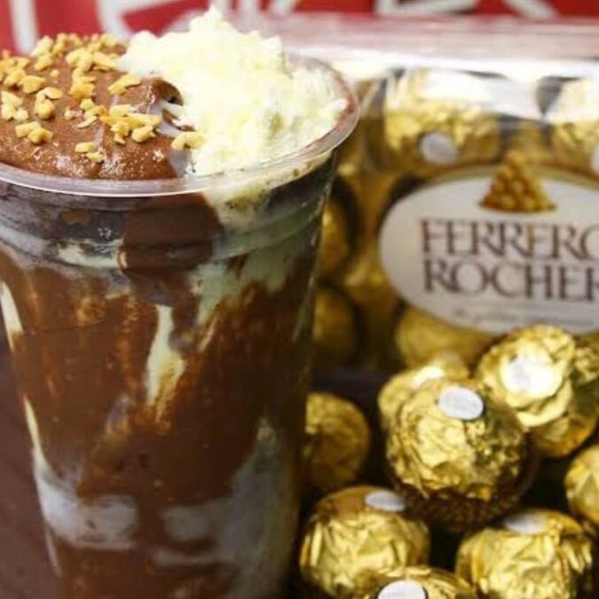 Brigadeiro ao leite , o gelado de sua escolha, amendoim triturado, chatilly e um bombom ferrero rocher.