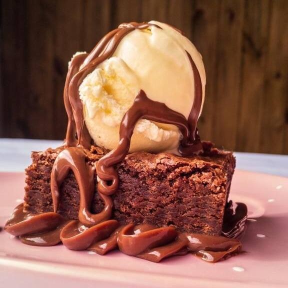 Um generoso pedaço de brownie de chocolate nobre ( 7x7cm) , uma deliciosa bola de gelado a sua escolha.
