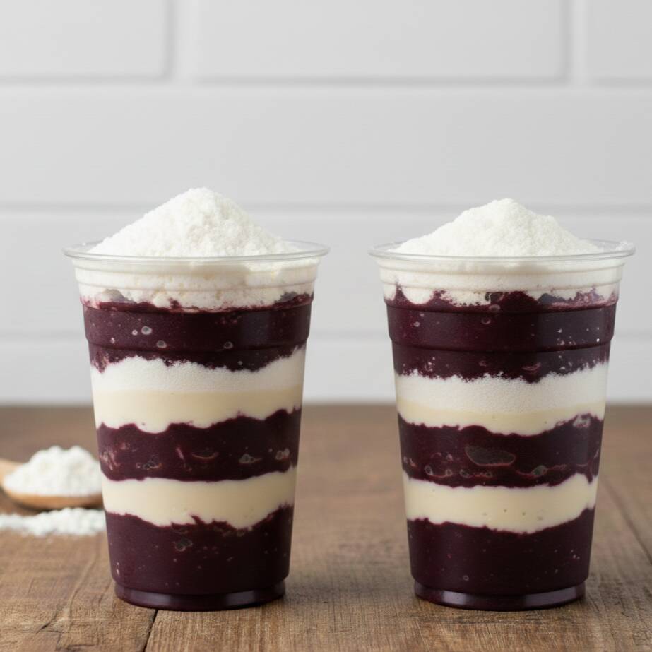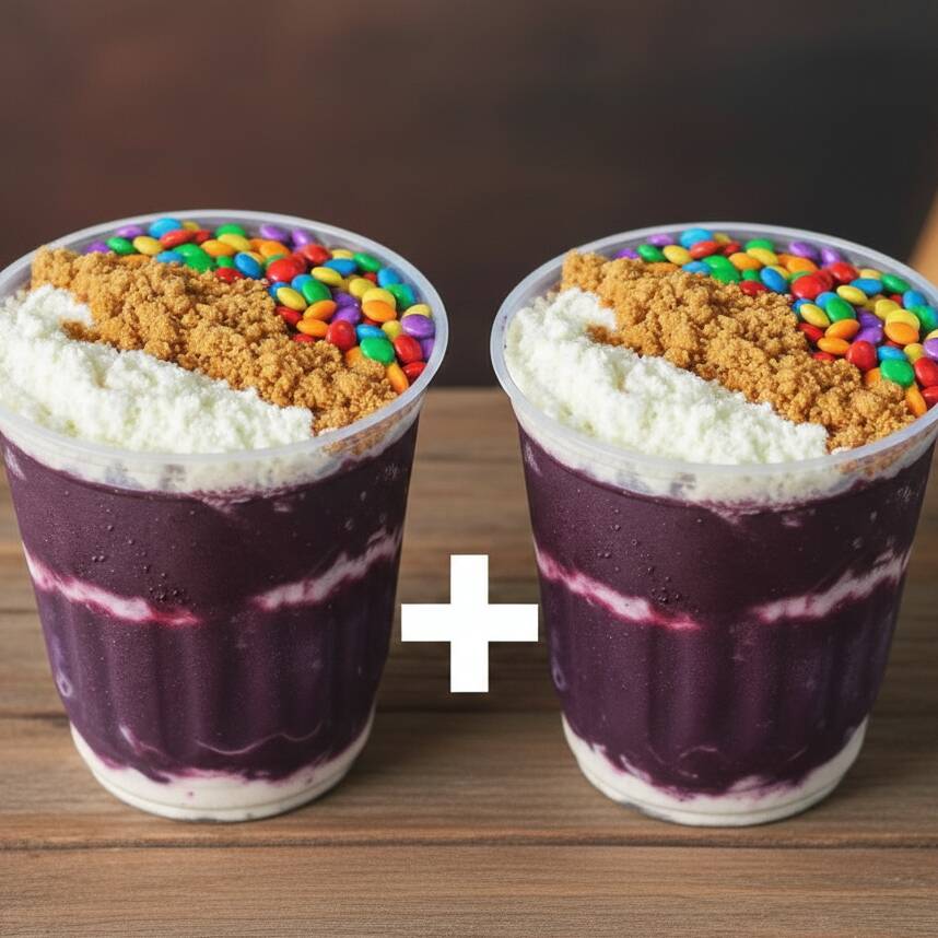 Para dividir com quem você gosta! 2 Copos de 300ml de Açaí cremoso, generosamente servidos com Leite em Pó e Leite Condensado