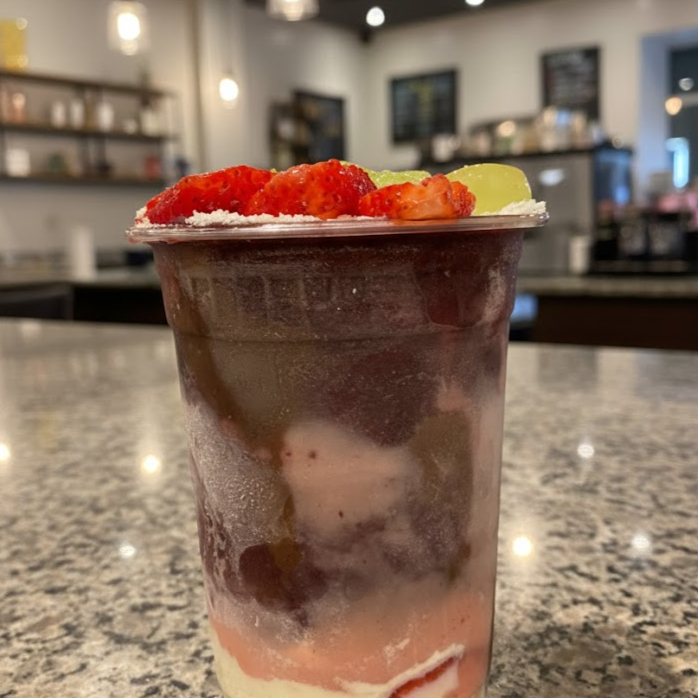 O queridinho da casa! Este copo é montado com o equilíbrio ideal entre o Creme de Ninho e o Creme de Avelã. Acompanha a refrescância da uva verde e do morango picado, finalizado com aquela camada generosa de leite em pó que você ama. Uma experiência completa em texturas e sabores!