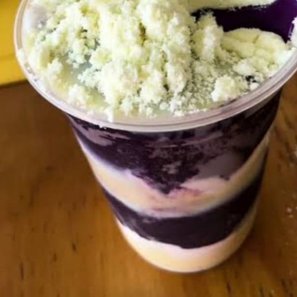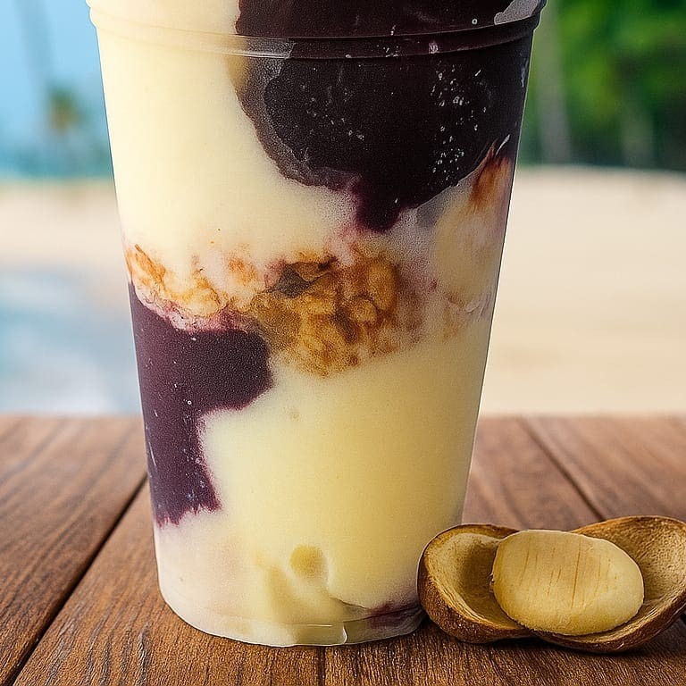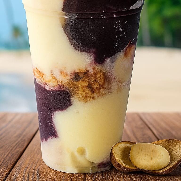 Creme de açaí + Cupuaçu com paçoca e leite condensado. Atenção: As imagens são apenas ilustrativas e servem para demonstrar a montagem do produto.