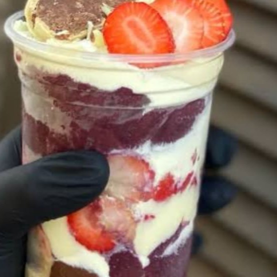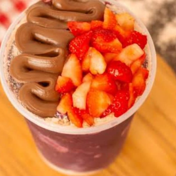 Açaí + creme de avelã + Sonho de Valsa + morango. Atenção: As imagens são apenas ilustrativas e servem para demonstrar a montagem do produto.