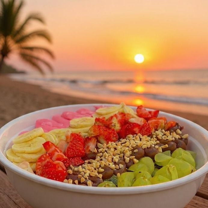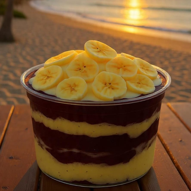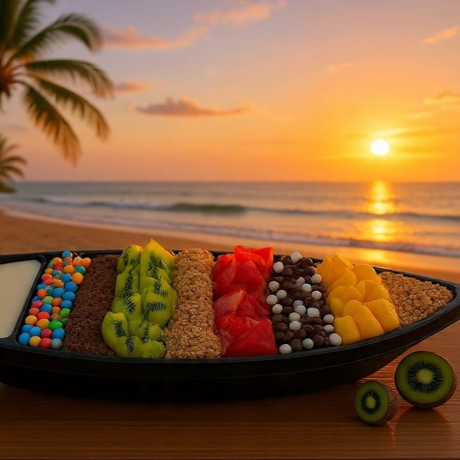 Barca de 1100 ml. Você pode escolher entre os sabores: Açaí, Cupuaçu, Pitaya e Pistache! Você tem direito a 7complementos!