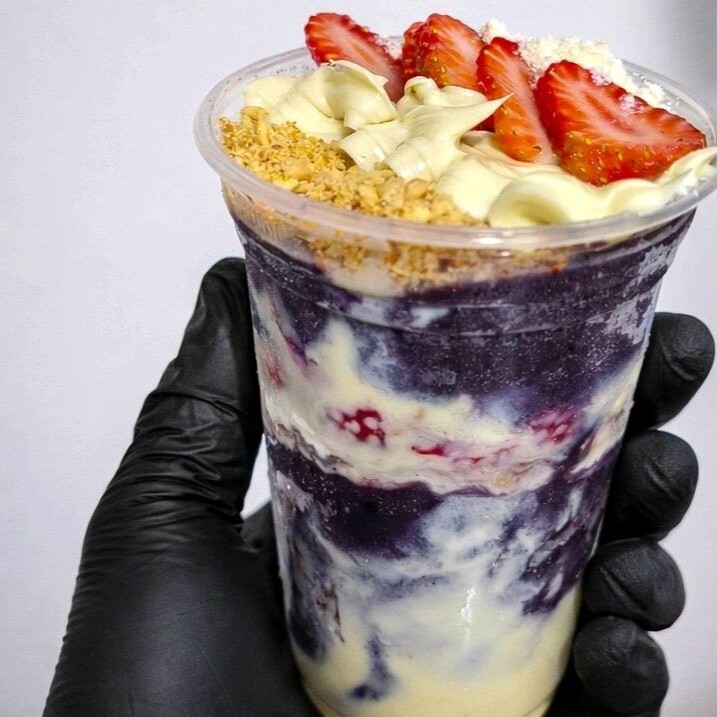 Açaí+ leite condensado+ leite em pó Ninho+ farofa crocante amendoim+ morango+ banana