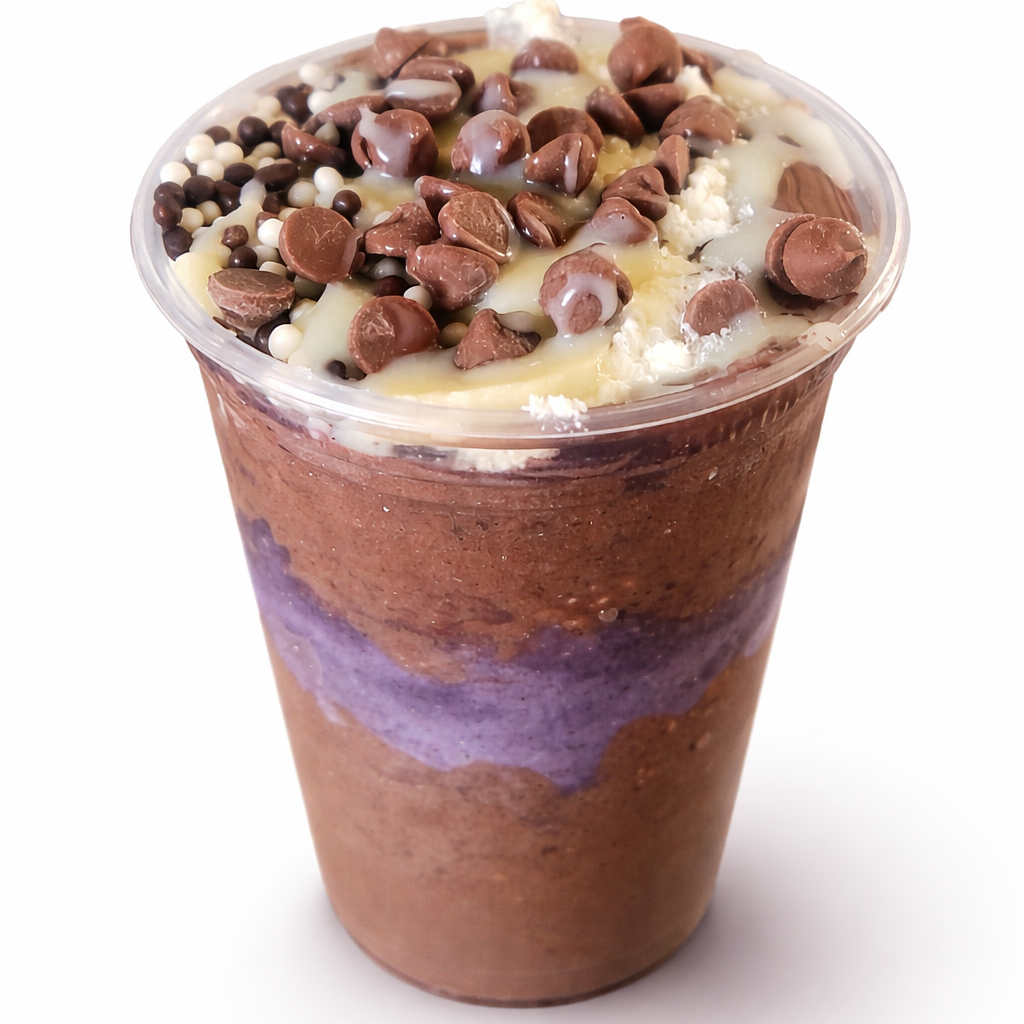 Açaí+Creme de avelã+ Leite em pó Ninho+ Gotas de chocolate+ Chocobol+ Banana Doce na medida.