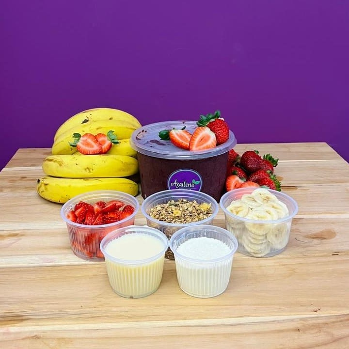 5 Complementos Grátis 100ml Leite condensado 100ml Leite Ninho 200ml Granola 200ml Morango 200ml Banana Adicionais vão no potinho de 100ml